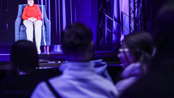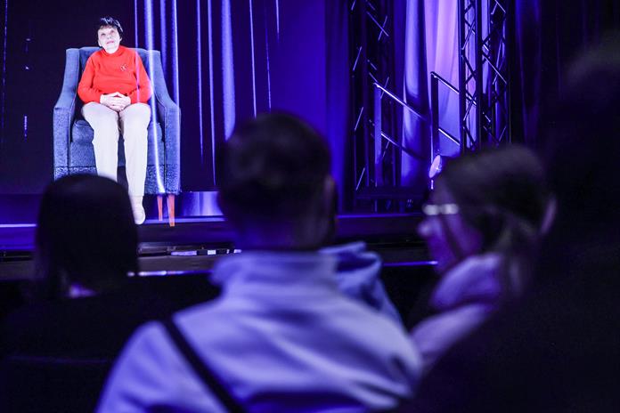 Sentada en su sillón azul, al escucharla y verla allí, en tamaño real, uno casi podría olvidar que solo se trata de un vídeo tridimensional proyectado en el escenario, frente a los estudiantes presentes.