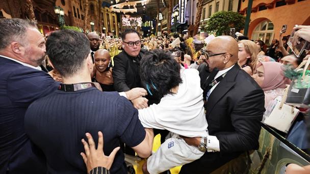 En los videos se ve a la coestrella de la actriz, Cynthia Erivo, que corre entonces para defenderla mientras los guardias de seguridad separan al australiano.