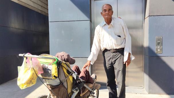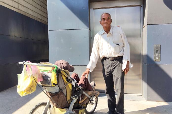 José de Jesús García Jiménez, de 83 años, está a cargo de su hijo Antonio de 29 años de edad, un joven al que transporta en una carreola.