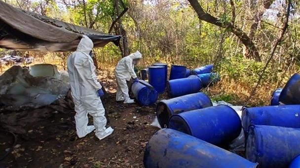 Asimismo, precisó que en el municipio de Cosalá, en el mismo estado, se destruyó un área de concentración con 1,550 litros y 275 kilos de sustancias químicas.