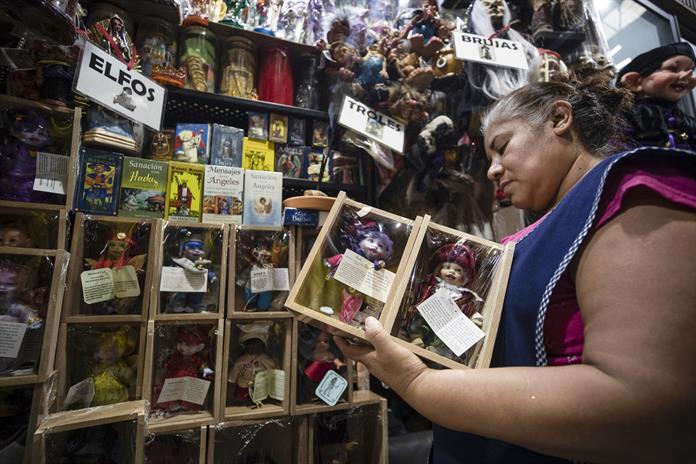Una de las vendedoras más experimentadas en el sector de las figuras esotéricas es Rocío Rivera, quien lleva tres décadas en el negocio de duendes, elfos, troles y brujas, en el local 63.