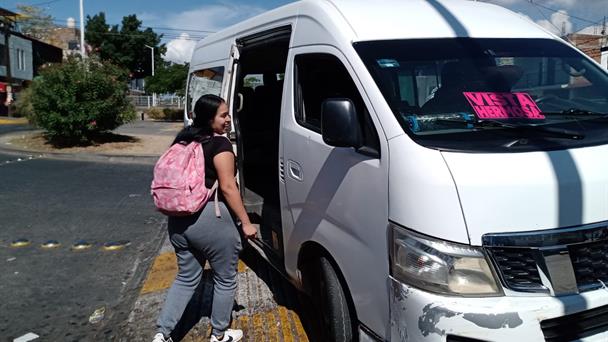 ...Vamos a colonia Mesa Poniente, son 27 minutos desde aquí Periférico y Federalismo, hasta la Mesa. Diez pesos parejos y los niños pagan cinco pesos. A estudiantes no hay descuento. A nosotros no nos han dicho nada sobre algún aumento)”