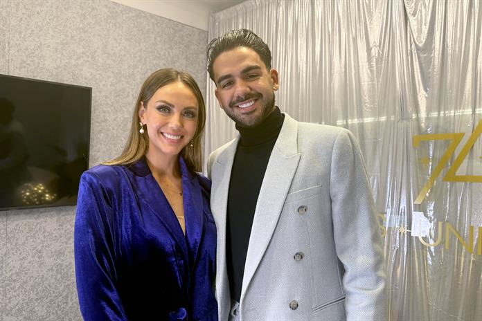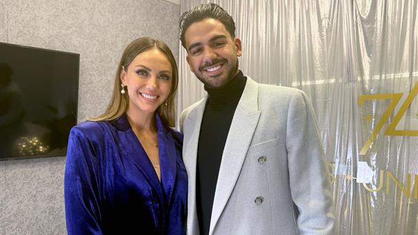 Fotografía de los conductores de Miss Universo en español, Danilo Carrera (i) y Jacqueline Bracamontes, posando durante una entrevista con EFE, en Miami (Estados Unidos). EFE/ Alicia Civita
