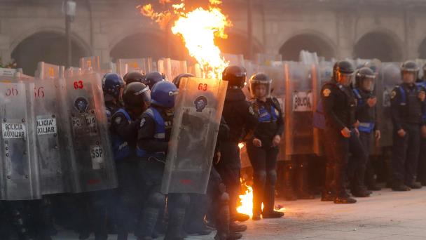 En el Zócalo la protesta se dividió en dos grupos: los manifestantes que querían realizar la protesta de manera pacífica y el llamado bloque negro u “anarquistas”, quienes lanzaron piedras, petardos, bombas molotov y cubetas de pintura a la policía de la Ciudad de México.