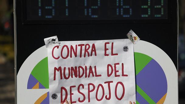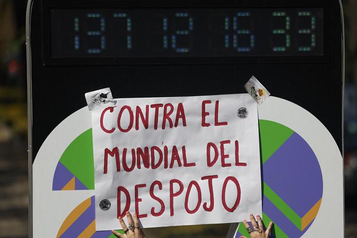 "El Mundial trae un sinnúmero de consecuencias que van desde la contaminación, el desplazamiento forzado de familias populares, comunidades y pueblos originarios, el despojo de bienes comunes como el agua o el aumento del costo del alquiler en un 155 %", denunció Diana, joven encargada de leer el manifiesto junto al reloj en el céntrico Bosque de Chapultepec y que marca la cuenta regresiva en la capital para que comience el torneo de fútbol.