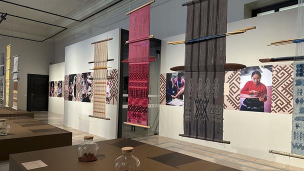 En la primera sección, telas decoradas y tensadas en telares cuelgan frente a los retratos de las tejedoras, y bajo esas piezas textiles se encuentran los materiales de los que se extraen los tintes de ciertas plantas y animales.
