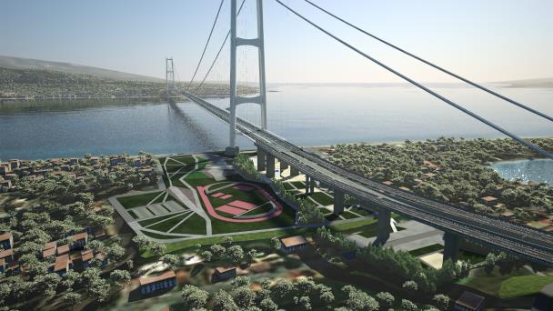 Este puente de 60 metros de ancho, tendrá 3.666 metros de longitud total (entre juntas de dilatación), mientras que su tramo suspendido, sostenido por dos torres de 399 metros de altura.