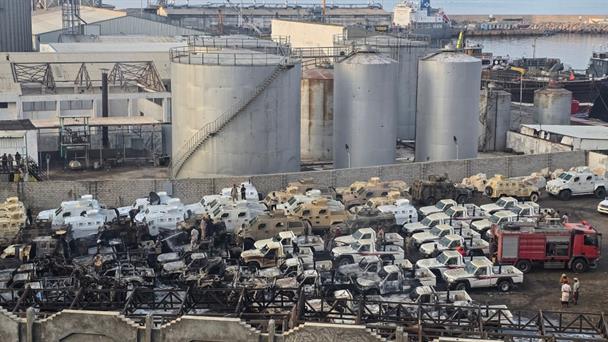 Imágenes de AFP muestran vehículos calcinados en el puerto y bomberos que intentan apagar el fuego. Las ventanas de los edificios cercanos estallaron por el ataque.