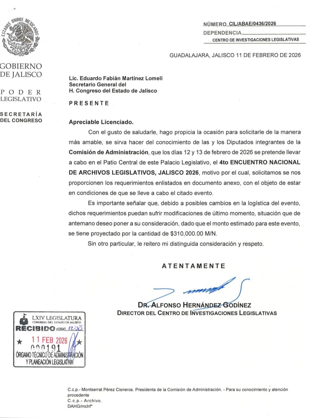 Tan sólo esta semana, los días jueves 12 y viernes 13 de febrero, la Comisión de Administración avaló un gasto proyectado de 310 mil pesos para la realización del 4º Encuentro Nacional de Archivos Legislativos, Jalisco 2026, a celebrarse en el Patio Central del Palacio Legislativo.