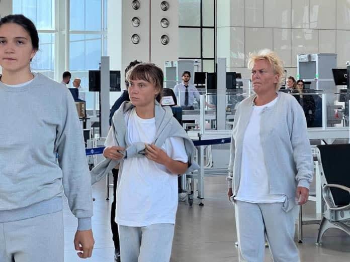 La publicación en X iba acompañada de fotos de Thunberg junto con otras dos mujeres caminando por el aeropuerto de Ramon, en el sur de Israel, vestidas con los chándales grises utilizados en las cárceles israelíes.