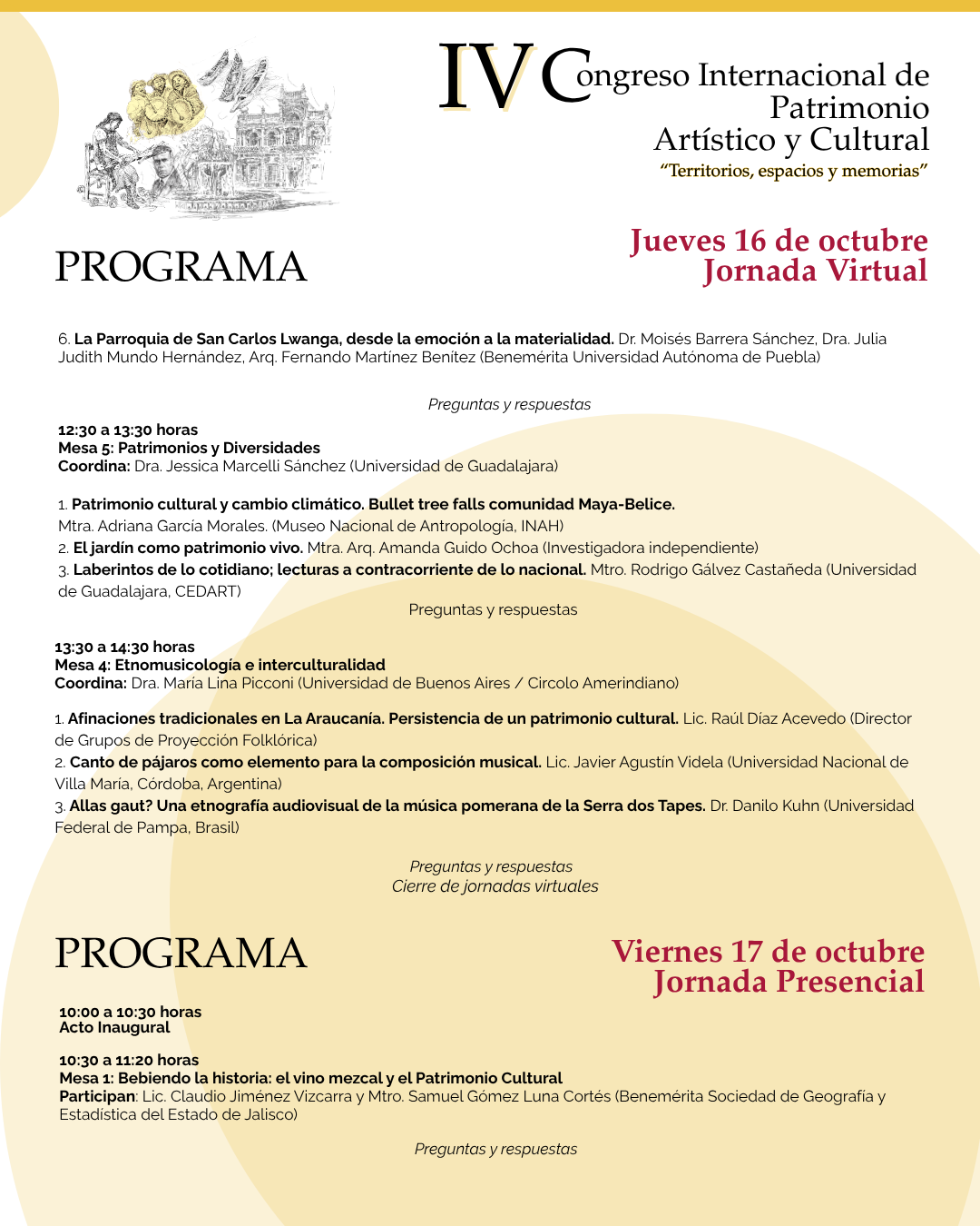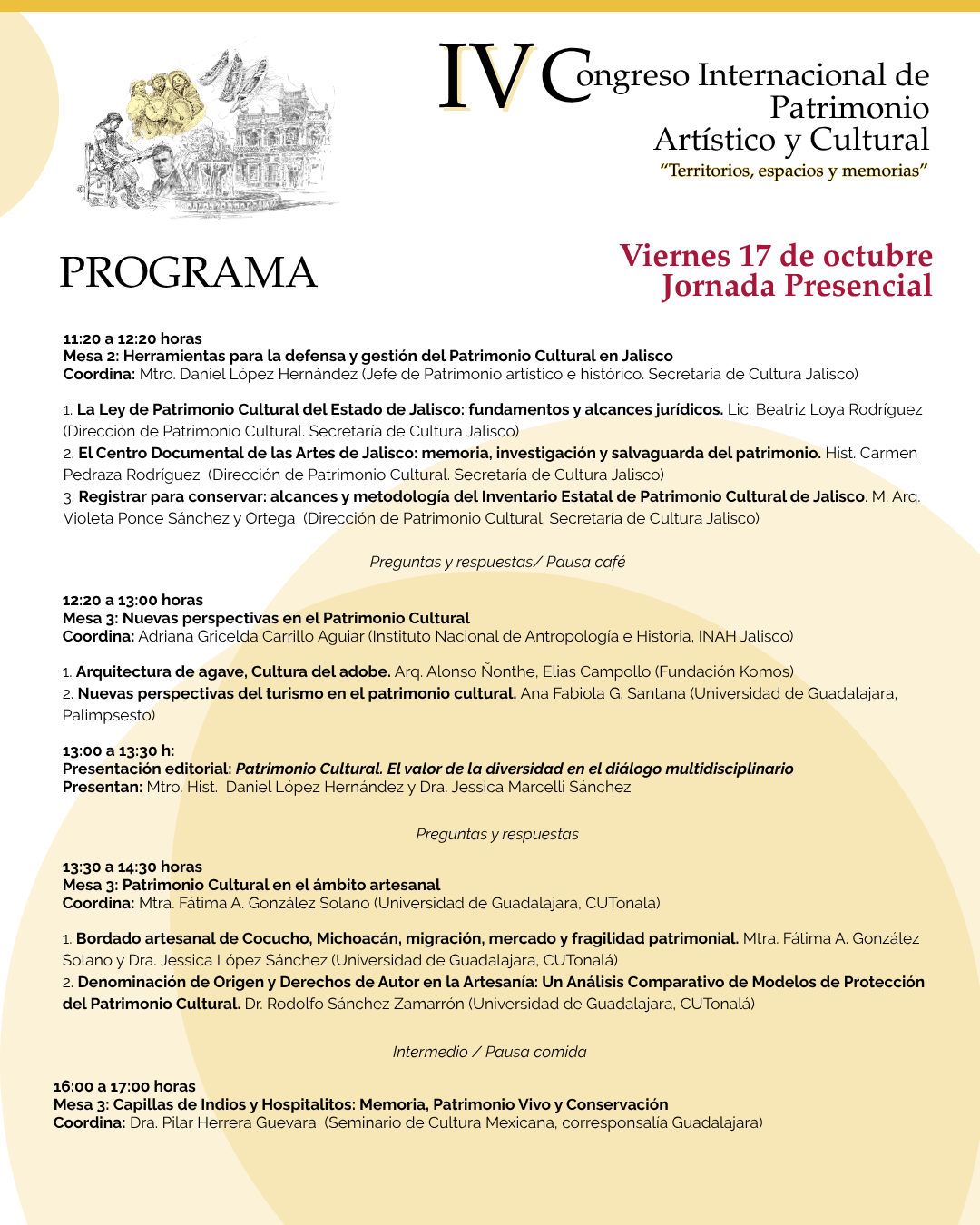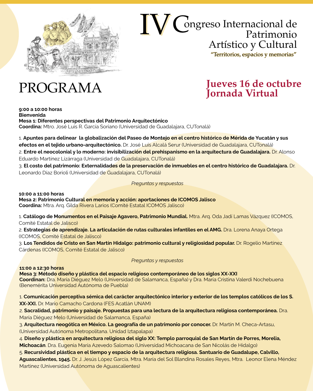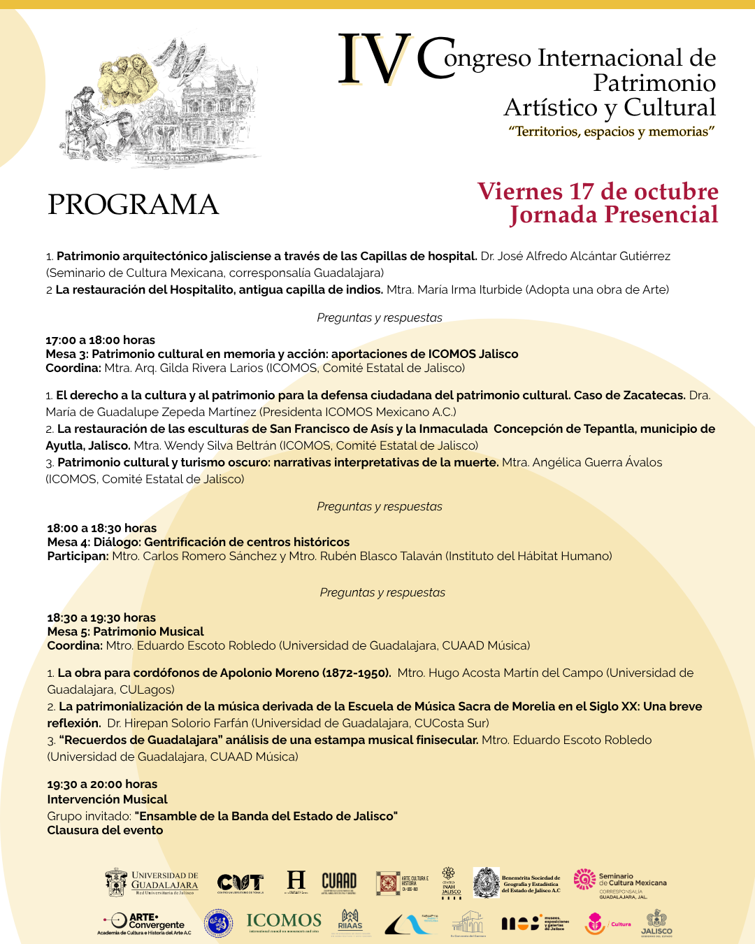 Ya de forma presencial, para el 17 de octubre en el Ex Convento del Carmen, tendrá presencia la Secretaría de Cultura de Jalisco, el Centro INAH Jalisco, la Benemérita Sociedad de Geografía y Estadística del Estado de Jalisco, ICOMOS, el Seminario de Cultura Mexicana, y diversas instituciones universitarias.