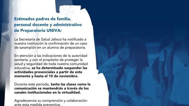 La preparatoria de la UNIVA se va a la virtualidad luego que se confirmó un caso de sarampión en un estudiante que no estaba vacunado.