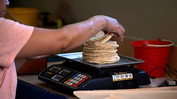 "Estamos sufriendo económicamente", dice Evangelina Canales de 54 años quien vende gorditas y quesadillas, dos comidas cuyo insumo principal es la tortilla, en un puesto ambulante en el centro de San Bartolo.