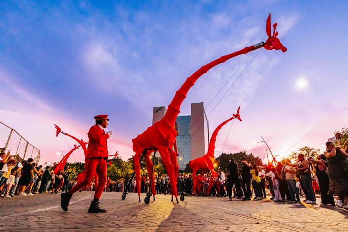 Siete jirafas de ocho metros de altura, operadas por artistas escénicos, acróbatas, bailarines y una cantante de ópera, fueron vistos por diez mil personas el sábado por la tarde y por más de 15 mil, la mañana del domingo.