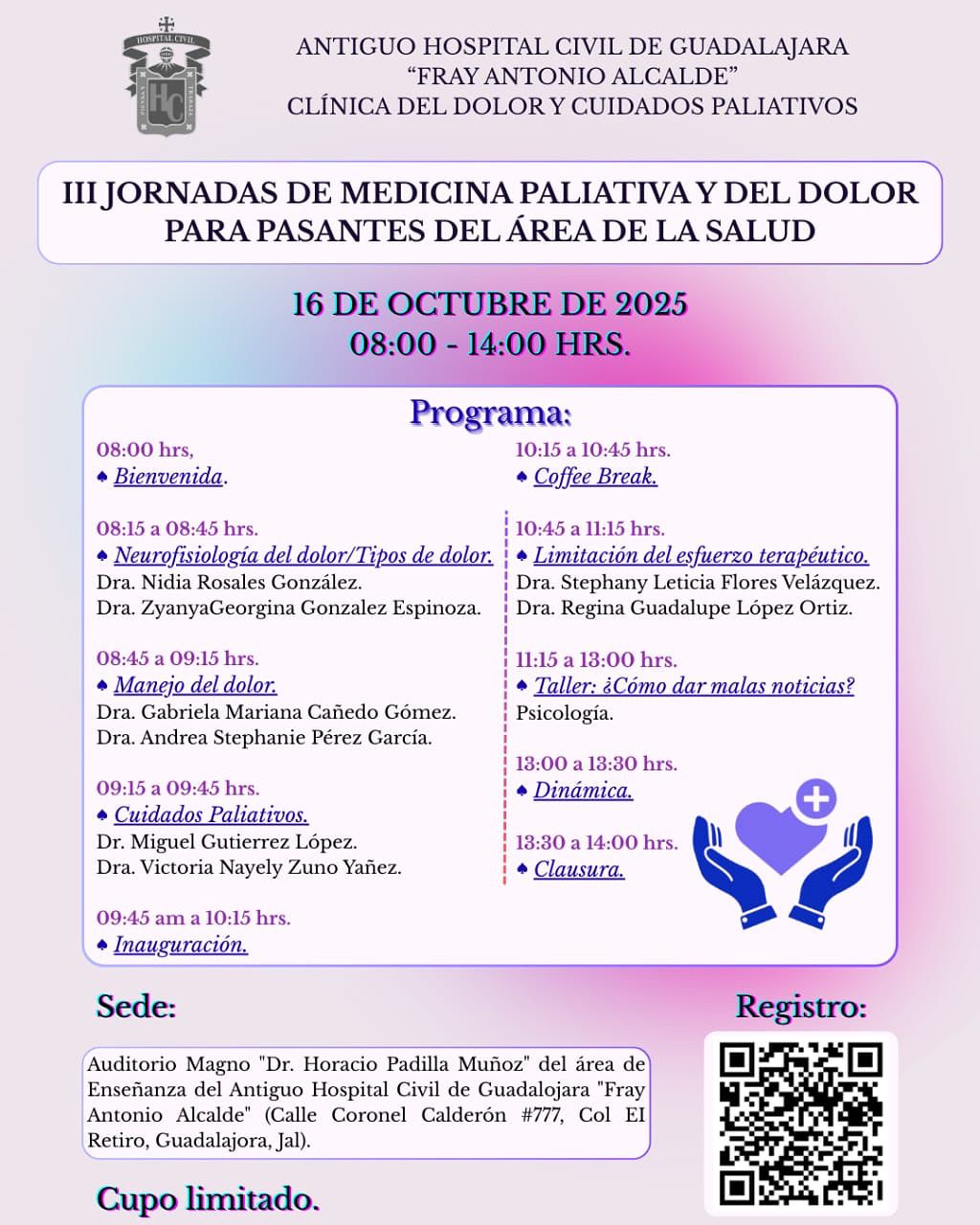 - Por esta razón, en el marco del Día Mundial de los Cuidados Paliativos la Unidad de Cuidados Paliativos Pediátricos del Nuevo Hospital Civil de Guadalajara y el servicio en el Fray Antonio Alcalde realizarán varias actividades para concientizar al personal médico y a la población en general sobre este derecho, detalla la médico Residente de la Especialidad de Medicina Paliativa Pediátrica, Laila Zulema García Ulloa: