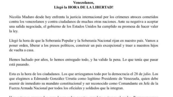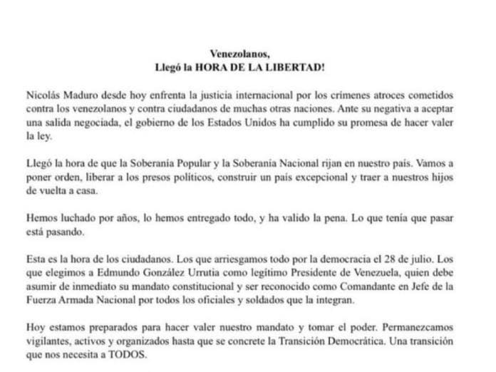 “Llegó la hora de que la Soberanía Popular y la Soberanía Nacional rijan en nuestro país. Vamos a poner orden, liberar a los presos políticos, construir un país excepcional y traer a nuestros hijos de vuelta a casa. Hemos luchado por años, lo hemos entregado todo, y ha valido la pena. Lo que tenía que pasar está pasando".