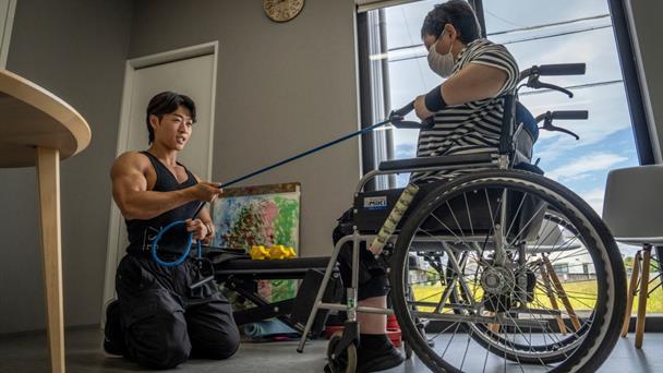 Con una camiseta de tirantes negra, que pone de aliviar su tez física, levanta sin esfuerzo a Madoka Yamaguchi, de 65 años, para ayudarla a comer, a lavarse los dientes y echarse gotas en los ojos.