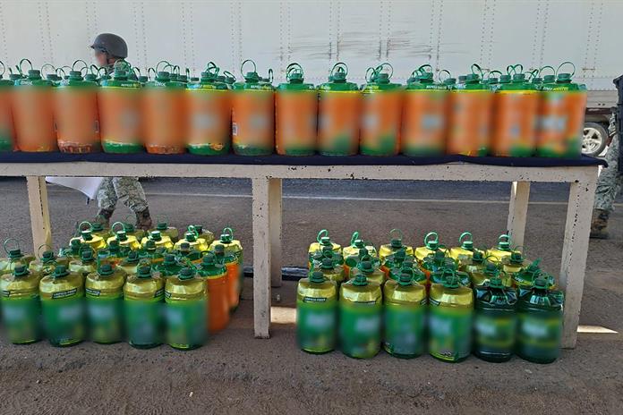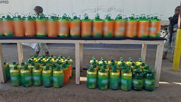 - Explicó que agentes de la fuerza de seguridad pública, en coordinación con el Ejército mexicano, ordenaron detenerse al conductor de un tráiler y durante la revisión localizaron dentro del vehículo 118 galones con aproximadamente 1.067 litros de metanfetamina líquida, la cual pretendía hacer pasar por limpiador multiusos, por lo cual fue detenido.