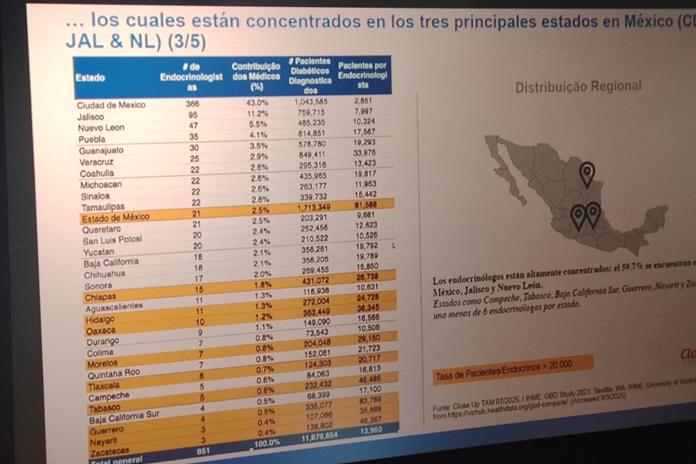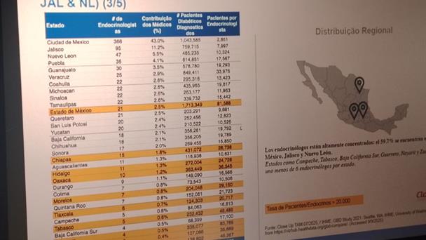 “Tenemos una distribución de especialidades no óptima para lo que México necesita, a México le duele tener un país con tanta diabetes, 40 por ciento entre diabéticos y prediabéticos y señalé específicamente en amarillo el número de endocrinólogos que tiene este país estamos abajo de 900 (...)