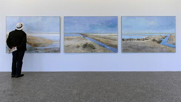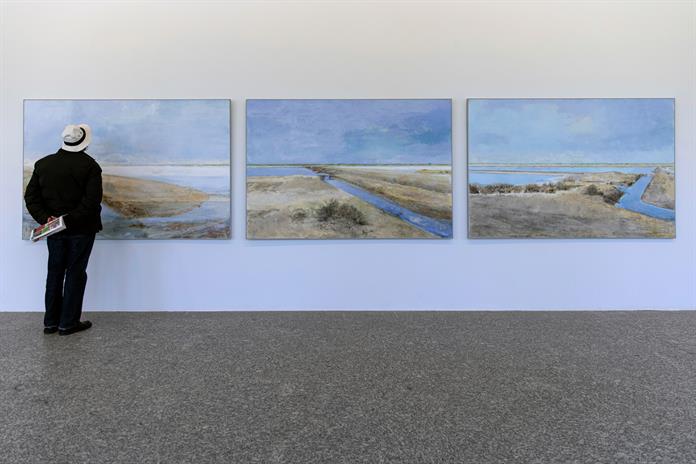 El subtítulo de la muestra, “el ojo que escucha”, remite a la relación metafórica entre su pintura, el silencio, la aparente calma que transmite, y el interés del artista por la música.