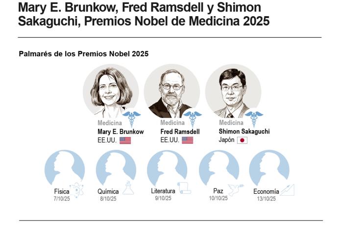 La Asamblea Nobel del Instituto Karolinska de Estocolmo ha informado hoy de la concesión del Premio Nobel de Medicina o Fisiología 2025 a Mary E. Brunkow, Fred Ramsdell y Shimon Sakaguchi "por sus descubrimientos relacionados con la tolerancia inmunológica periférica".