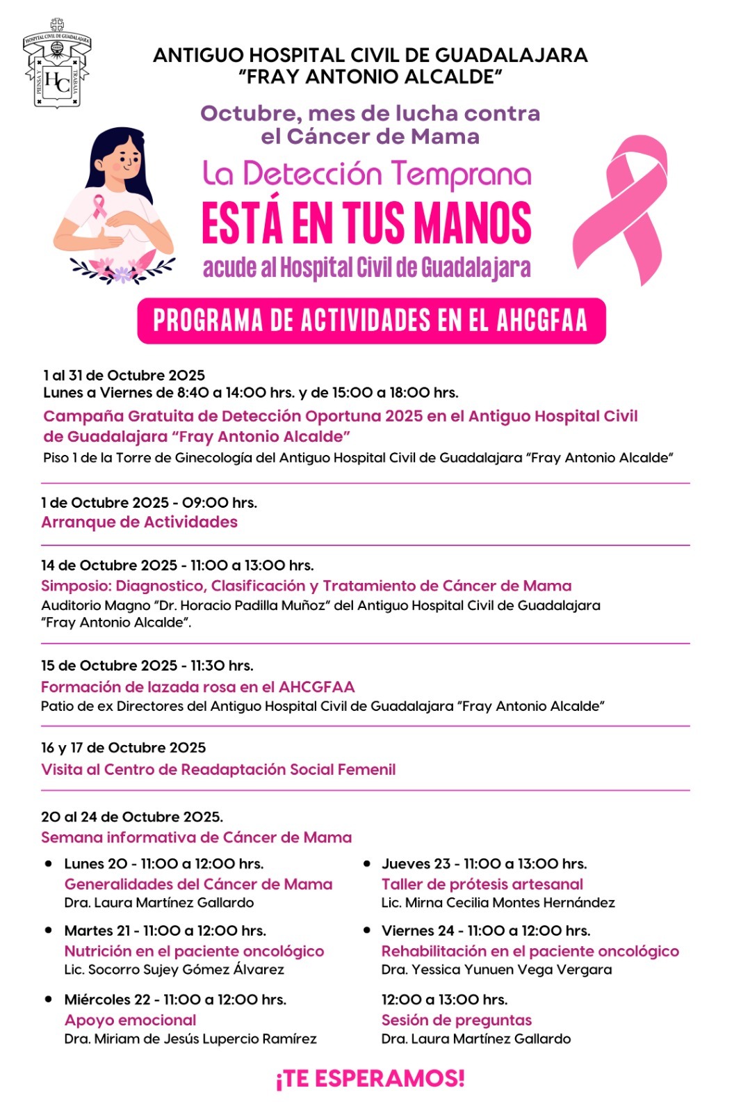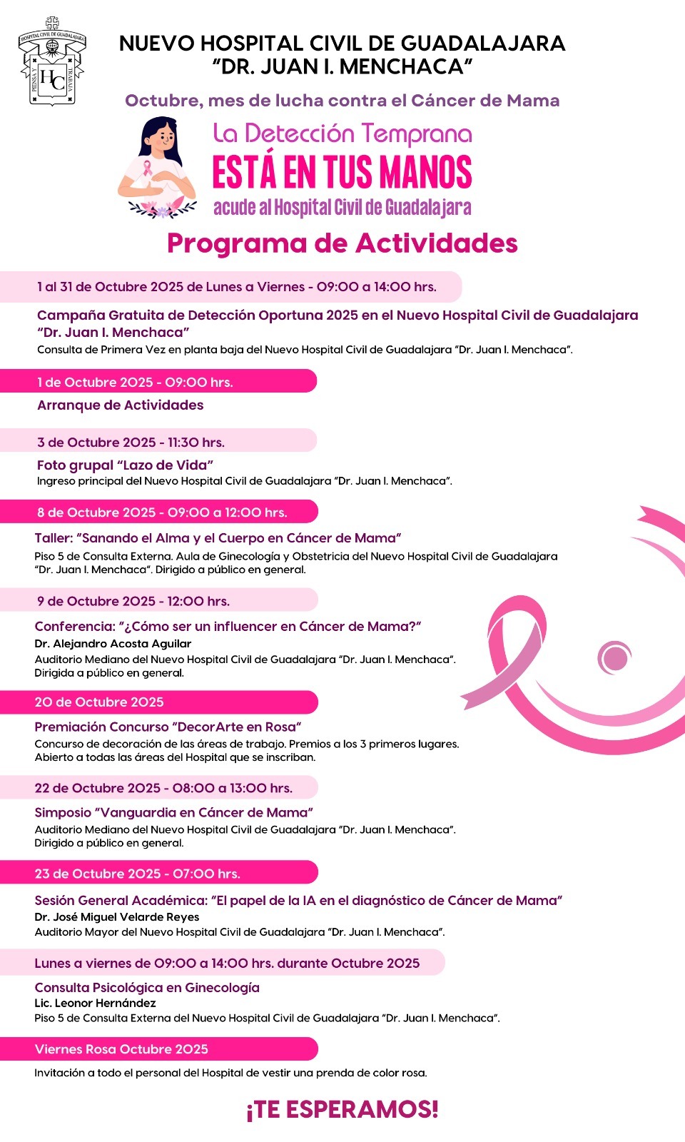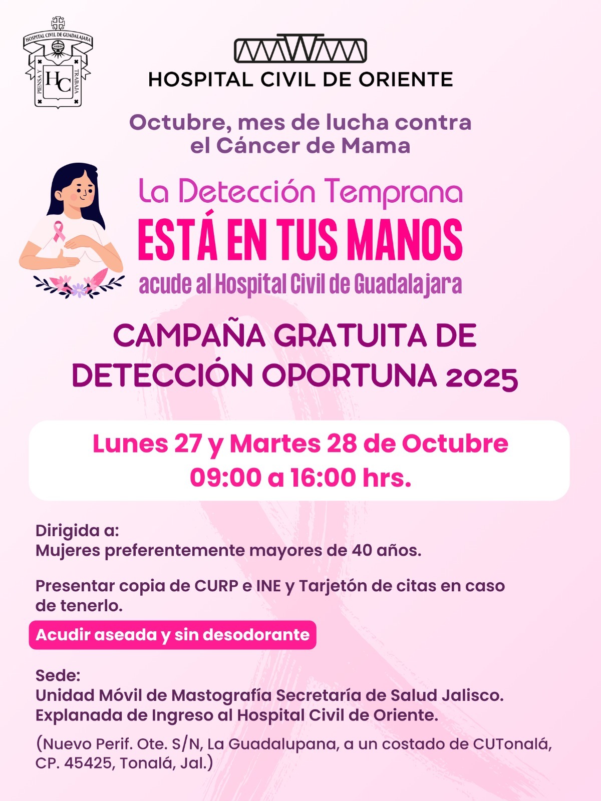 Por esta razón, durante todo el mes rosa, es decir, durante todo el mes de octubre los Hospitales Civiles de Guadalajara tendrán una Campaña Gratuita de Detección Oportuna bajo el lema “La detección temprana está en tus manos”.