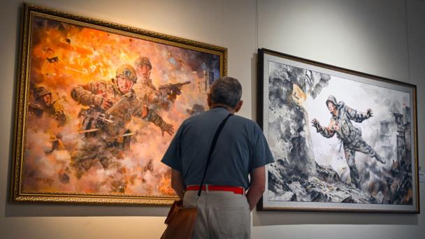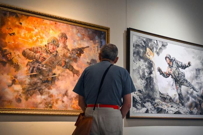 Más adelante, un lienzo retrata a combatientes camuflados de ambos países ondeando sus banderas nacionales. Otros artistas se dedican a dibujar lanzamisiles o cazas bombardeando una isla.