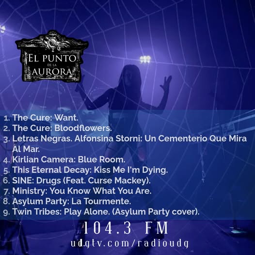 Aquí lo escuchado este miércoles 07 de enero en El Punto De La Aurora por Radio Universidad de Guadalajara:The Cure: Want.The Cure: Bloodflowers.Letras Negras. Alfonsina Storni: Un Cementerio Que Mira Al Mar.Kirlian Camera (official): Blue Room.This Eternal Decay: Kiss Me I'm Dying.SINE: Drugs (Feat. Curse Mackey).Ministry: You Know What You Are.Asylum Party: La Tourmente.Twin Tribes: Play Alone. (Asylum Party cover).#ElPuntoDeLaAurora #RadioUdeG