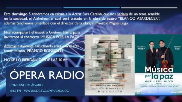 Este domingo 5 a las 10 a.m. en Ópera Radio con Ernesto Álvarez: entrevista con Sara Catalán sobre el Alzheimer y la obra “Blanco Atardecer”. Invitación del maestro Greimer Parra al concierto “Música por la Paz” y arias del tenor Franco Bonisolli.